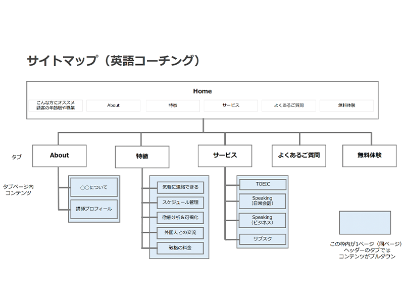 ヒアリング内容やリサーチの内容をもとに上記のようなサイトマップを作成します。